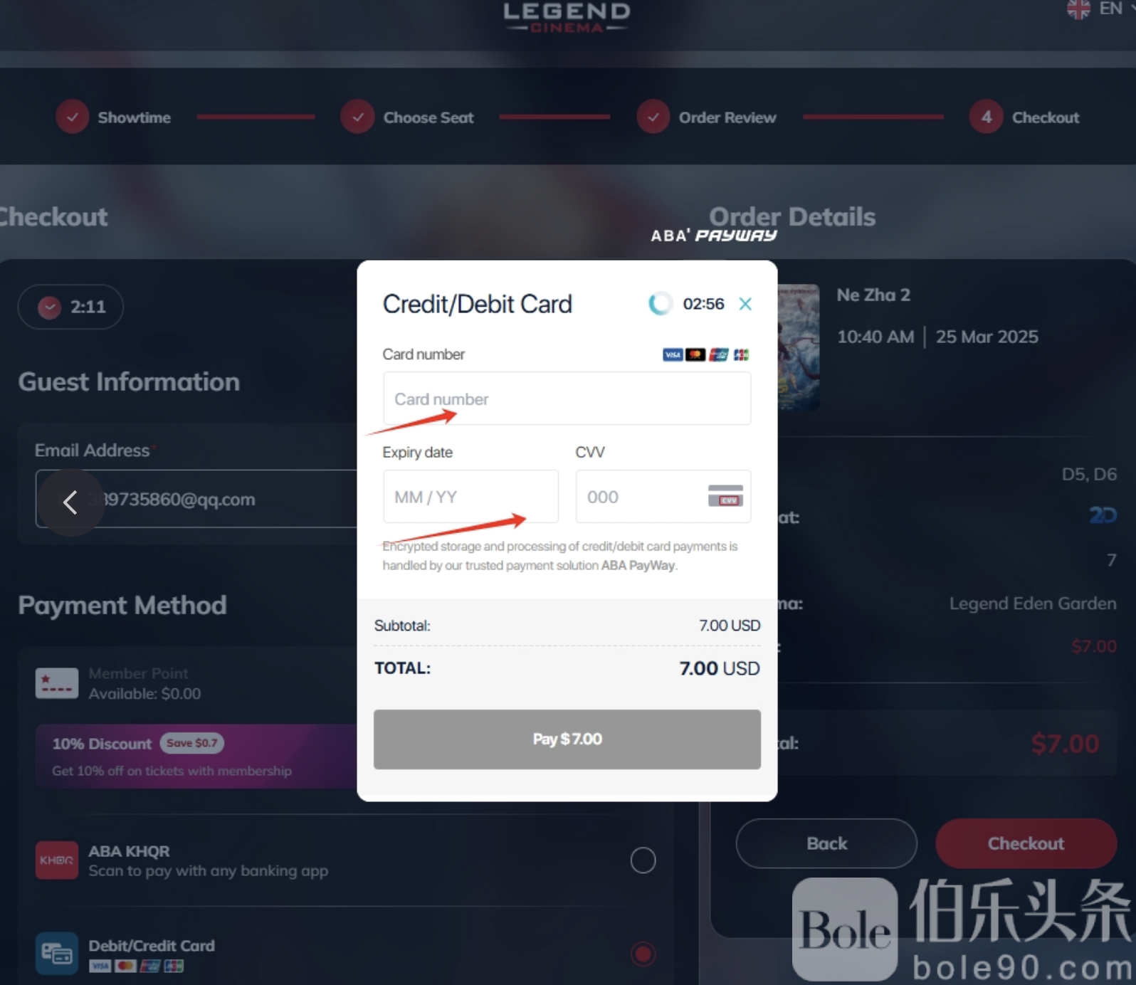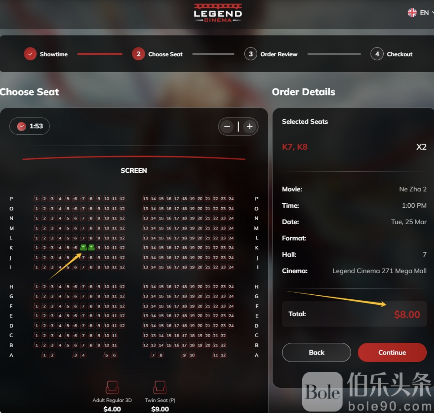 传奇影院的电影票价格大概在3美元到4美元之间,比国内还便宜一点。选好座位后,点击“继续”,进入付款页面。