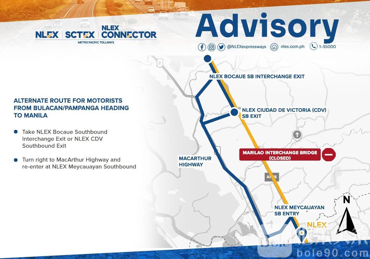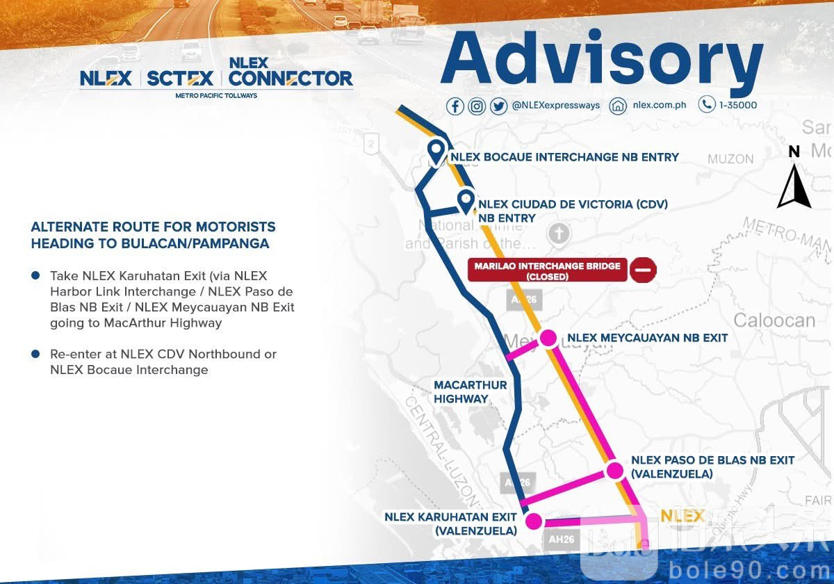 伯乐头条专讯:NLEX 公司周六表示,由于马里劳立交桥进行维修,使用北吕宋高速公路往返马尼拉的驾驶员可以选择以下替代路线: