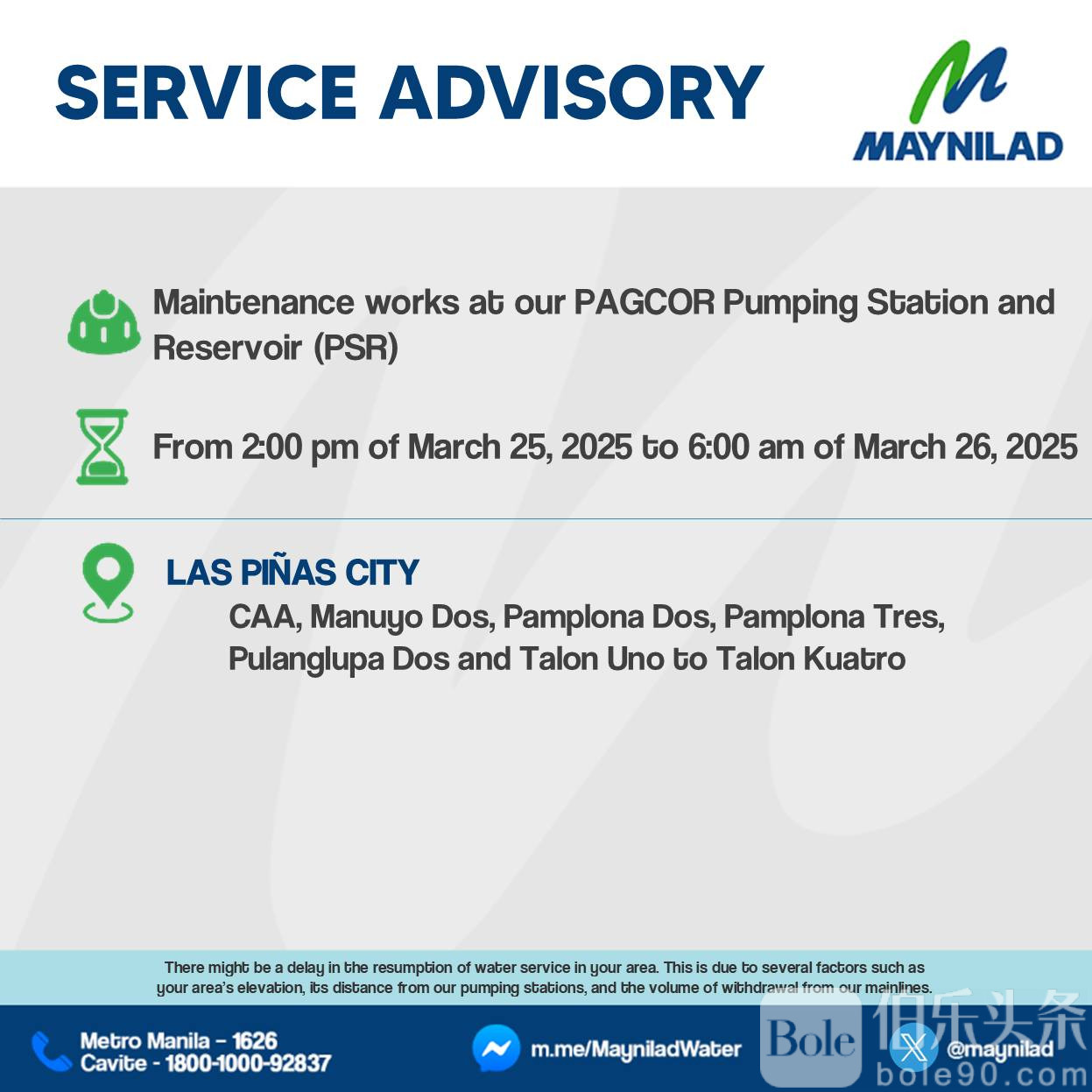拉斯皮纳斯市政府表示,梅尼拉德水务公司将于上述日期对 PAGCOR 泵站和水库进行维护工作。