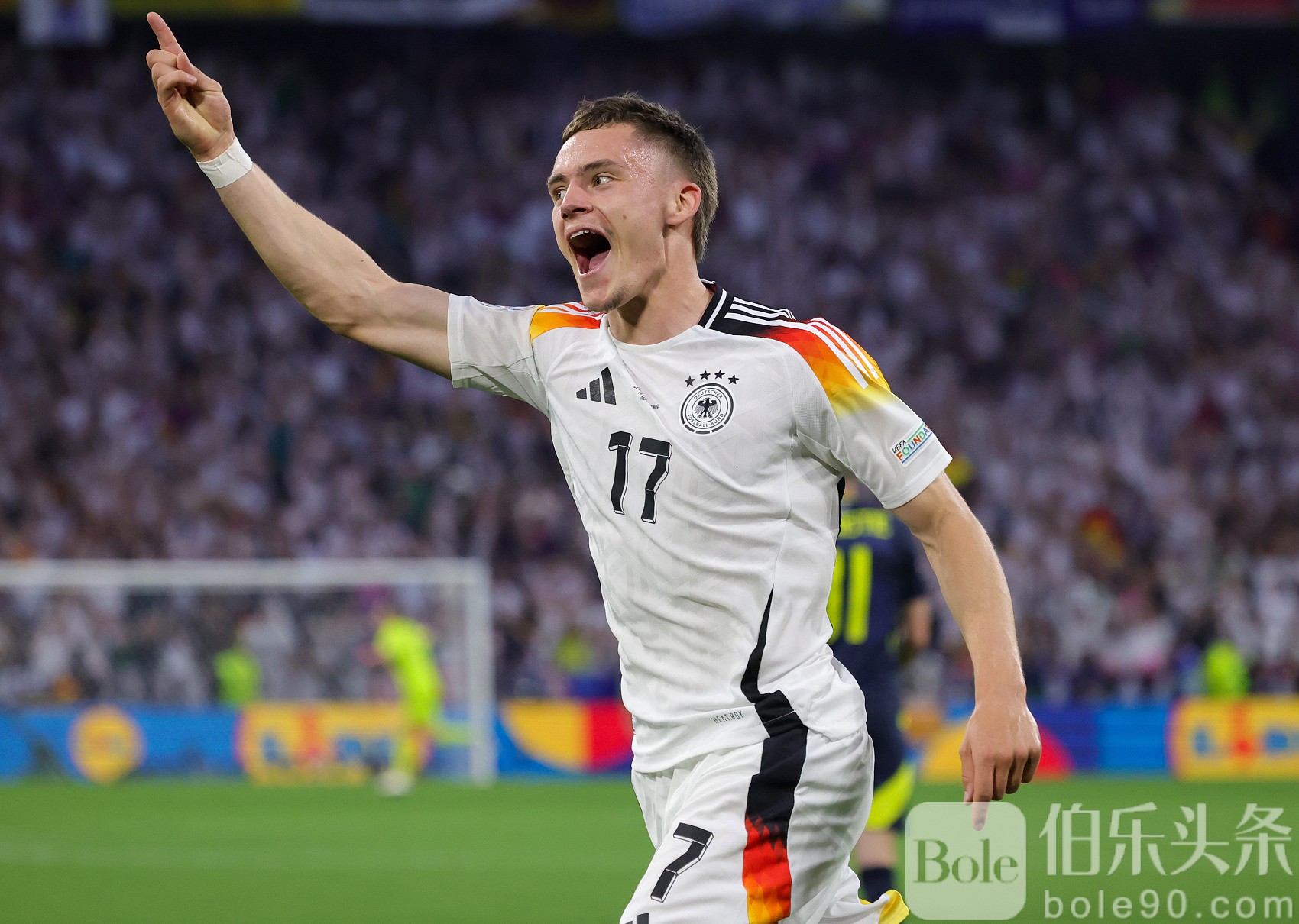 开场仅10分钟,本届欧洲杯第一个进球就诞生了,克罗斯大范围转移到右路,右后卫基米希横传,在大禁区弧顶处无人盯防的维尔茨劲射虽然被苏格兰门将冈恩扑了一下,但皮球仍然击中立柱弹入网窝。作为德甲新科冠军勒沃库森的进攻灵魂,维尔茨在本届欧洲杯取得开门红,以21岁42天的年龄打破哈弗茨在上届欧洲杯创下的德国球员在欧洲杯上的最年轻进球纪录(22岁8天)。