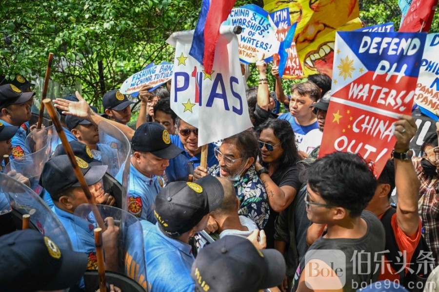 菲律宾民众周五去到马尼拉的中国大使馆外示威,抗议中方的休渔令及中国海警的新规定时,和手持盾牌的警察推撞,场面一度混乱。-法新社-
