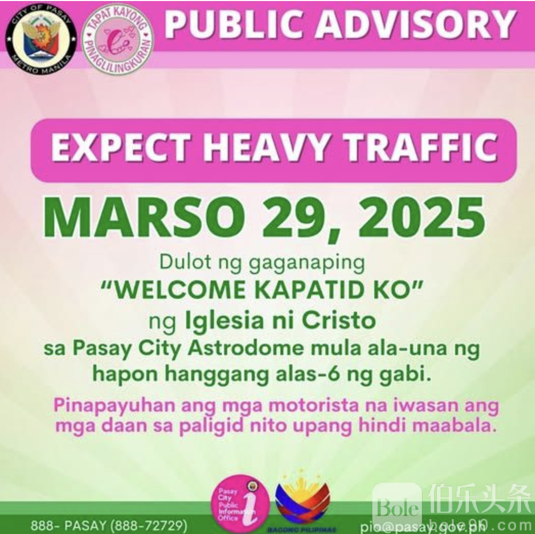 伯乐头条专讯:帕赛市政府近日发布交通预警,称由于菲律宾基督教会(INC)将在3月29日(周六)举办大型宗教活动“Welcome Kapatid Ko”,当天市区部分道路可能出现严重交通拥堵。