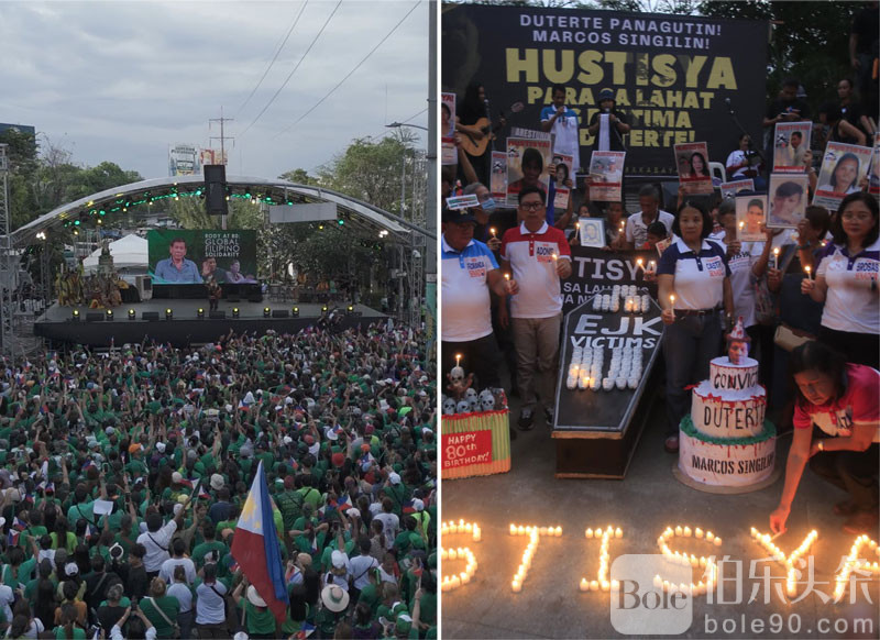 与此同时,数千名杜特尔特的支持者在达沃市举行了庆祝集会。然而,反对杜特尔特的活动人士以及法外处决受害者的亲属则在马尼拉的利瓦桑·博尼法西奥纪念碑前点燃蜡烛抗议。