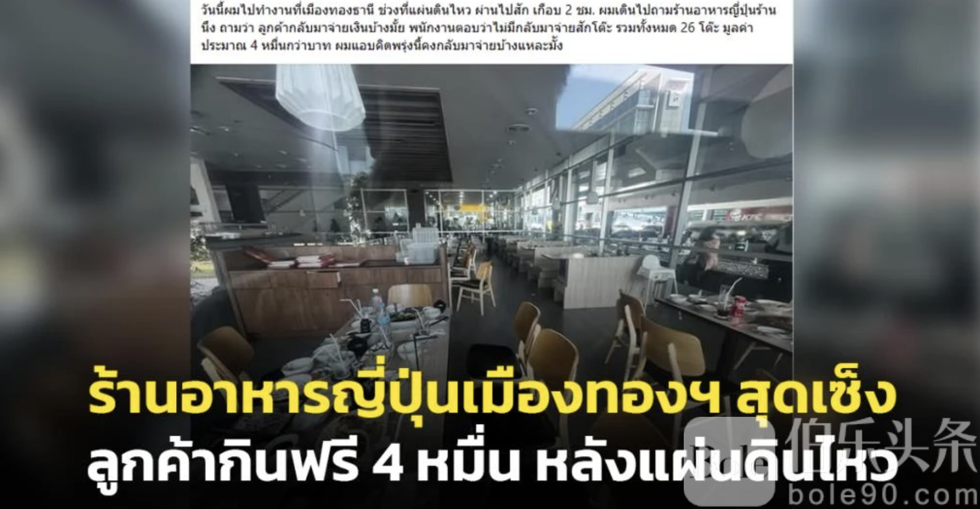 目前,泰国某脸书账户发布了一则帖子称,地震当天有家日本餐厅里的顾客都匆忙跑出店外,待到事情初步平息后,清点发现共计26桌客人,却没有一人返回付钱。其表示称,地震后约2小时依然没有人返回付钱,预计总损失约4万泰铢,暂不知后续是否会有人前来付钱。