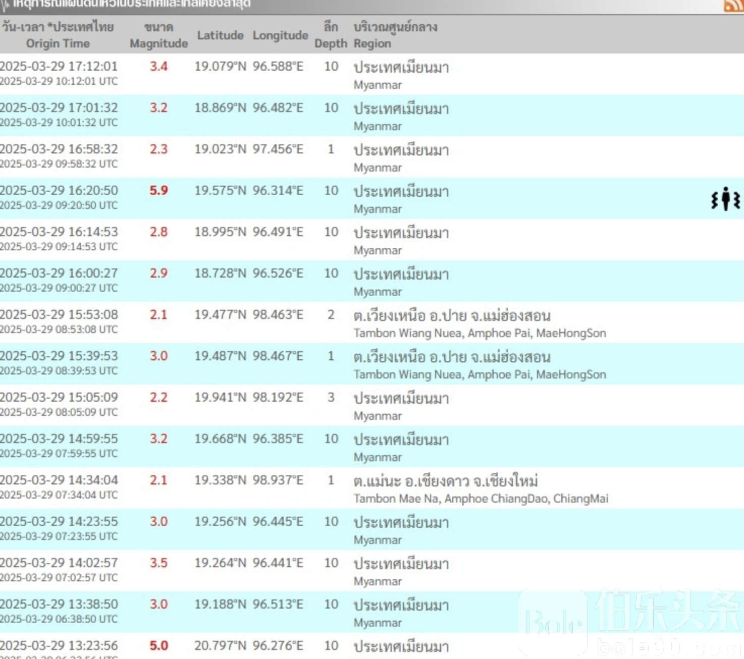 伯乐头条专讯:3月29日16时25分,缅甸发生5.9级地震,震中位于北纬19.575°、东经96.314°,震源深度约10公里,震中距离泰国夜丰颂府直辖县西北约176公里。