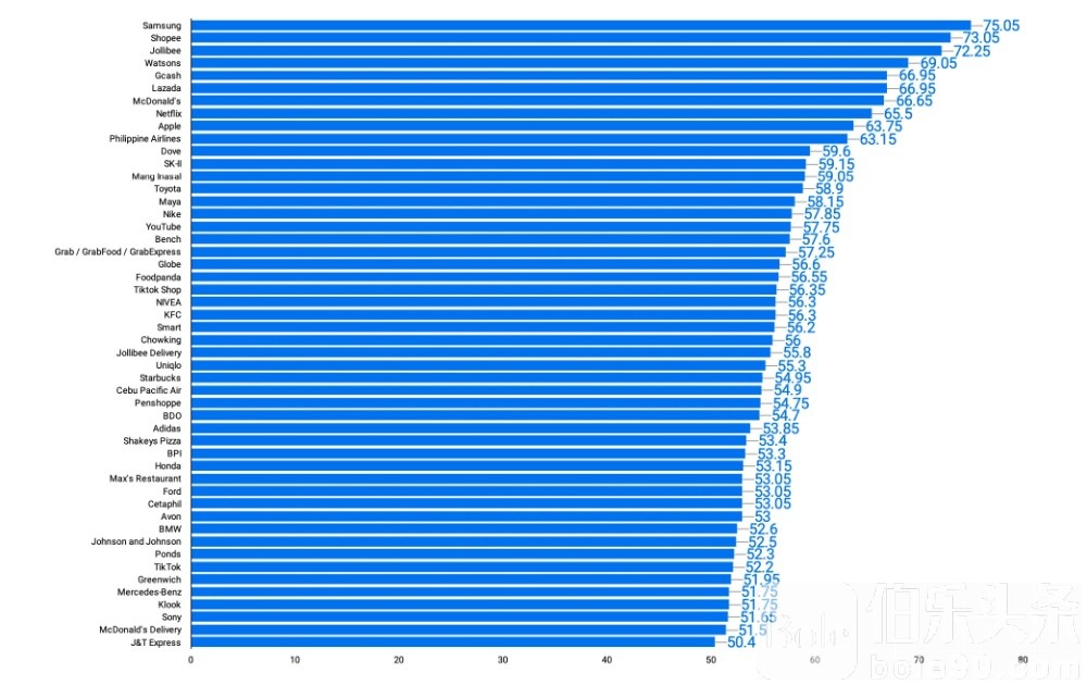 本土品牌快乐蜂、GCash和菲律宾航空公司也成功跻身前十。快乐蜂作为菲律宾领先的快餐品牌,以其独特的口味和广受欢迎的产品,深受消费者喜爱。GCash则作为领先的数字支付平台,在市场上继续扩展其影响力,尤其在创新和用户友好性方面表现突出。菲律宾航空公司作为该国的主要航空运营商,尽管价格相对较高,但在服务质量和可信度上仍赢得了消费者的青睐。