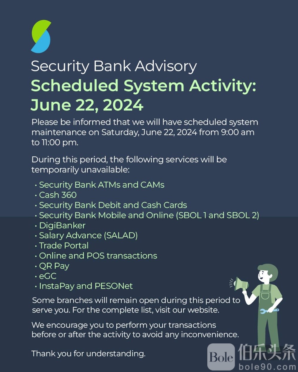 伯乐头条专讯:信安银行(Security Bank)宣布将于6月22日(周六)进行关键的系统维护,以确保其服务的稳定性。维护时间为上午9点至晚上11点,在此期间,大部分服务将暂停使用。