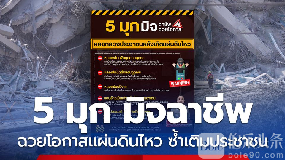 伯乐头条专讯:3月30日,据泰国媒体报道,泰国国家警察总署副发言人斯利瓦警少校表示,国家警察总署署长吉迪拉警上将对此次地震受灾民众表示关切,并提醒广大民众提高警惕,谨防不法分子趁灾害期间实施诈骗,进一步加重受灾群众的损失。