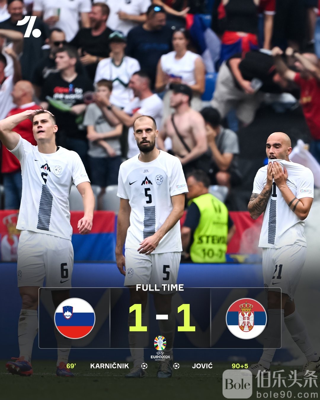 比赛进入最后阶段,塞尔维亚队全力进攻,斯洛文尼亚队门前风声鹤唳。伤停补时阶段,塞尔维亚队终于迎来转机。补时第5分钟,塞尔维亚队获得角球机会。替补前锋卢卡·约维奇高高跃起,头球攻门,皮球直入网窝。塞尔维亚队在最后一秒将比分扳平,比赛以1-1结束。