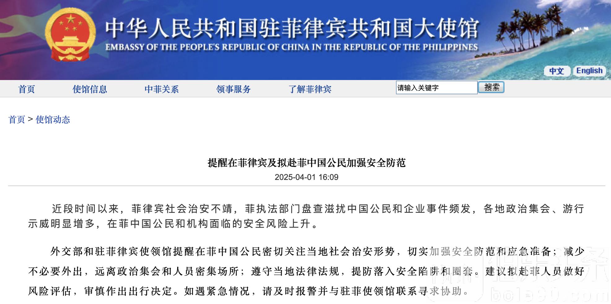 外交部和驻菲律宾使领馆提醒在菲中国公民密切关注当地社会治安形势,切实加强安全防范和应急准备;减少不必要外出,远离政治集会和人员密集场所;遵守当地法律法规,提防落入安全陷阱和圈套。建议拟赴菲人员做好风险评估,审慎作出出行决定。如遇紧急情况,请及时报警并与驻菲使领馆联系寻求协助。