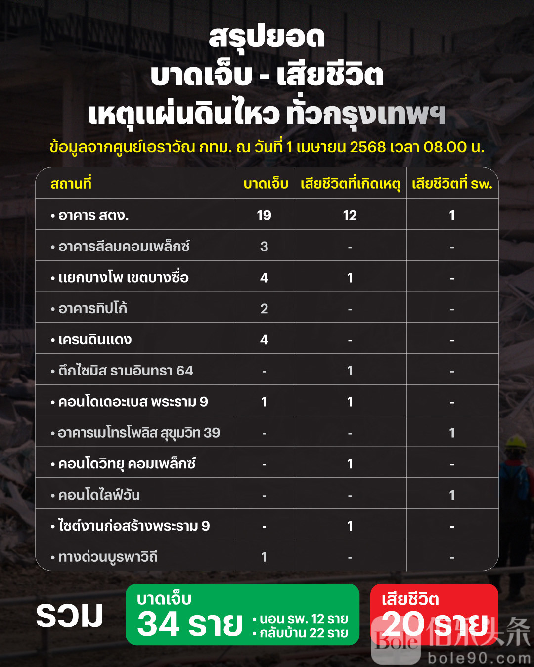 伯乐头条专讯:据泰国媒体报道,4月1日,曼谷Erawan Center紧急医疗中心发布报告称,截止2025年3月31日下午17点20分,此次地震已造成20人死亡,34人受伤,主要分布在以下地区:
