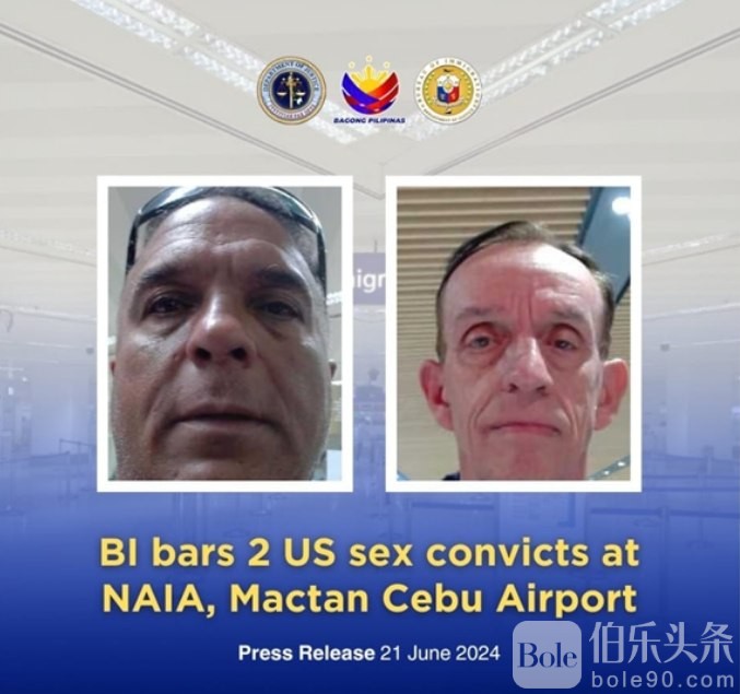 伯乐头条专讯:菲律宾移民局(BI)近日在马尼拉和宿雾国际机场拦截了两名被美国判定有性犯罪记录的美国人,阻止他们进入菲律宾境内。
