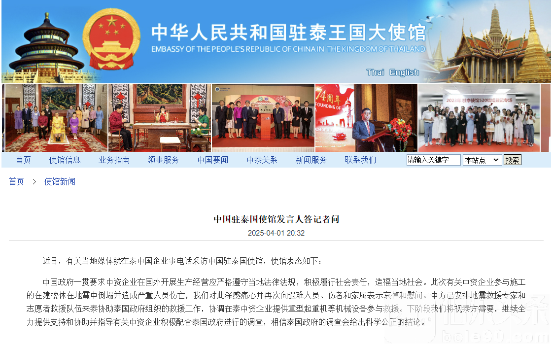 中国政府一贯要求中资企业在国外开展生产经营应严格遵守当地法律法规,积极履行社会责任,造福当地社会。此次有关中资企业参与施工的在建楼体在地震中倒塌并造成严重人员伤亡,我们对此深感痛心并再次向遇难人员、伤者和家属表示哀悼和慰问。中方已安排地震救援专家和志愿者救援队伍来泰协助泰国政府组织的救援工作,协调在泰中资企业提供重型起重机等机械设备参与救援。下阶段我们将视泰方需要,继续全力提供支持和协助并指导有关中资企业积极配合泰国政府进行的调查,相信泰国政府的调查会给出科学公正的结论。(来源:中国驻泰大使馆)