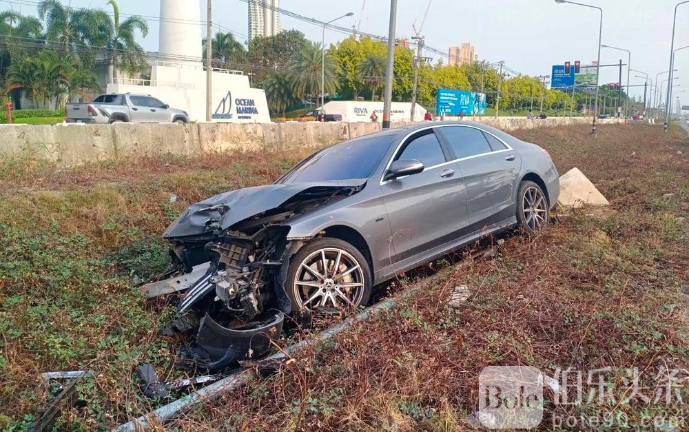伯乐头条专讯:一辆豪华奔驰车闯红灯后在芭堤雅撞上路灯,两名中国游客在警方到达前逃离了现场。