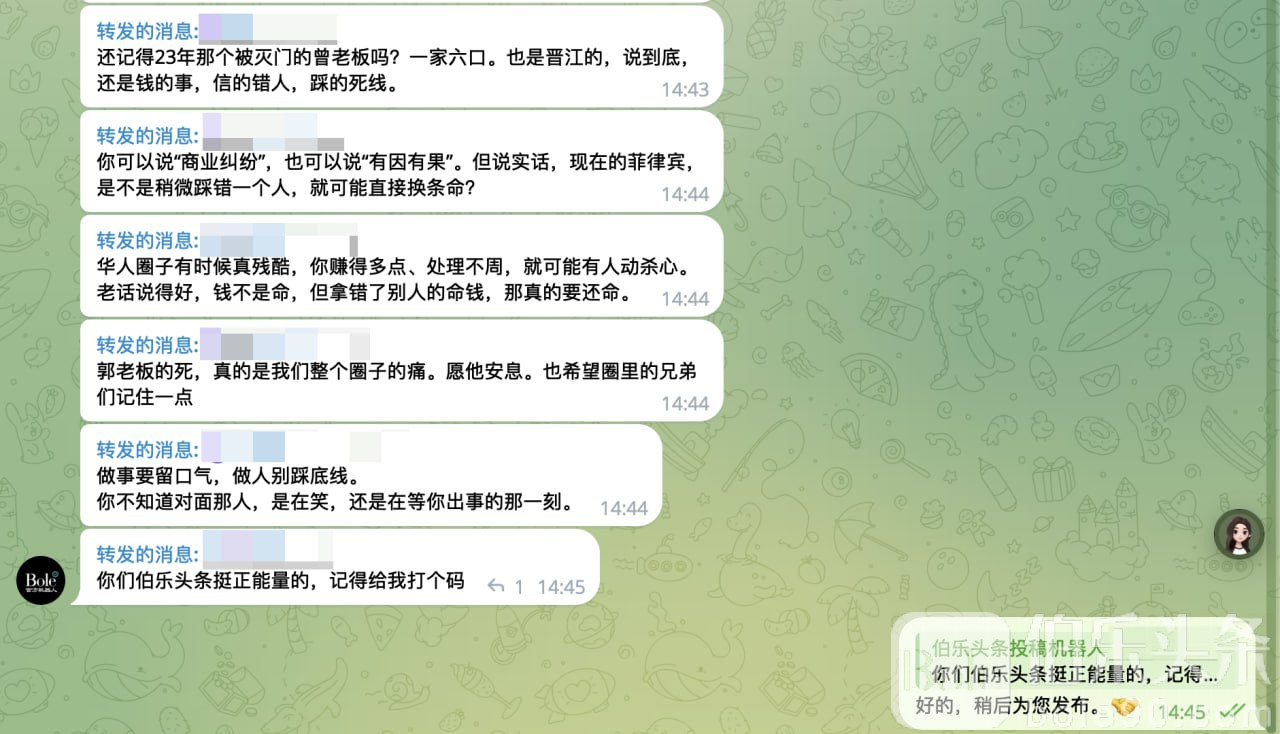 这件事告诉我们,即便一个华商,再低调、谦和、不惹事,依旧难逃毒手。联想到2023年曾姓晋江商人一家六口被杀案、BGC华裔少年被绑案,都告诉我们:绑匪瞄准的已不是“高调富人”,而是整个华人群体。