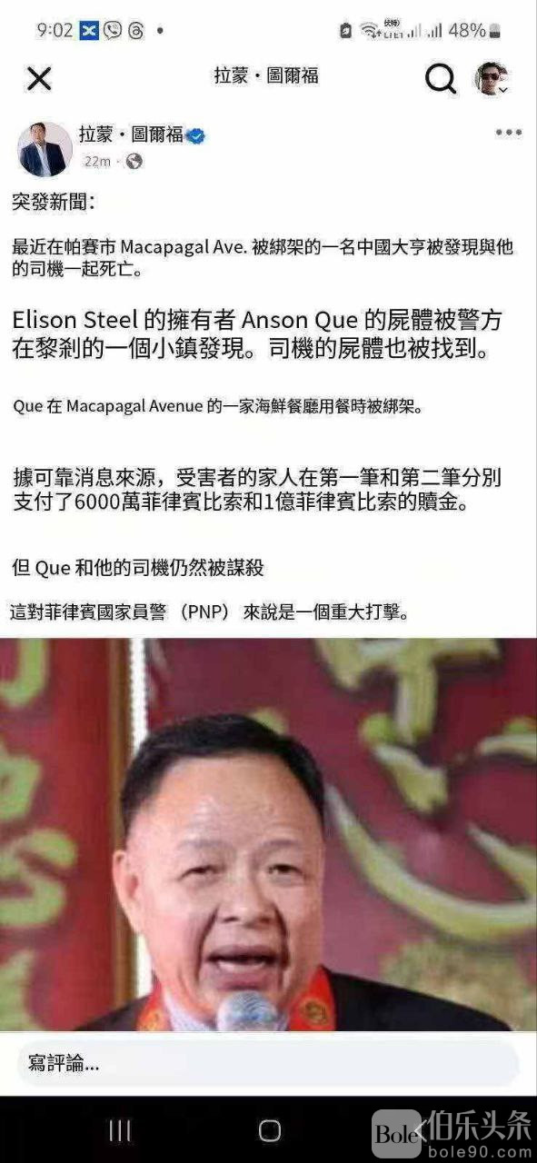 伯乐头条专讯:这两天,一桩撕票惨案震动菲律宾商界,一位华人钢铁业巨头在马尼拉遭遇残忍绑杀——尽管家属支付了2.1亿比索赎金,最终仍未换回一条活路,在遭受了大量殴打虐待后殒命。