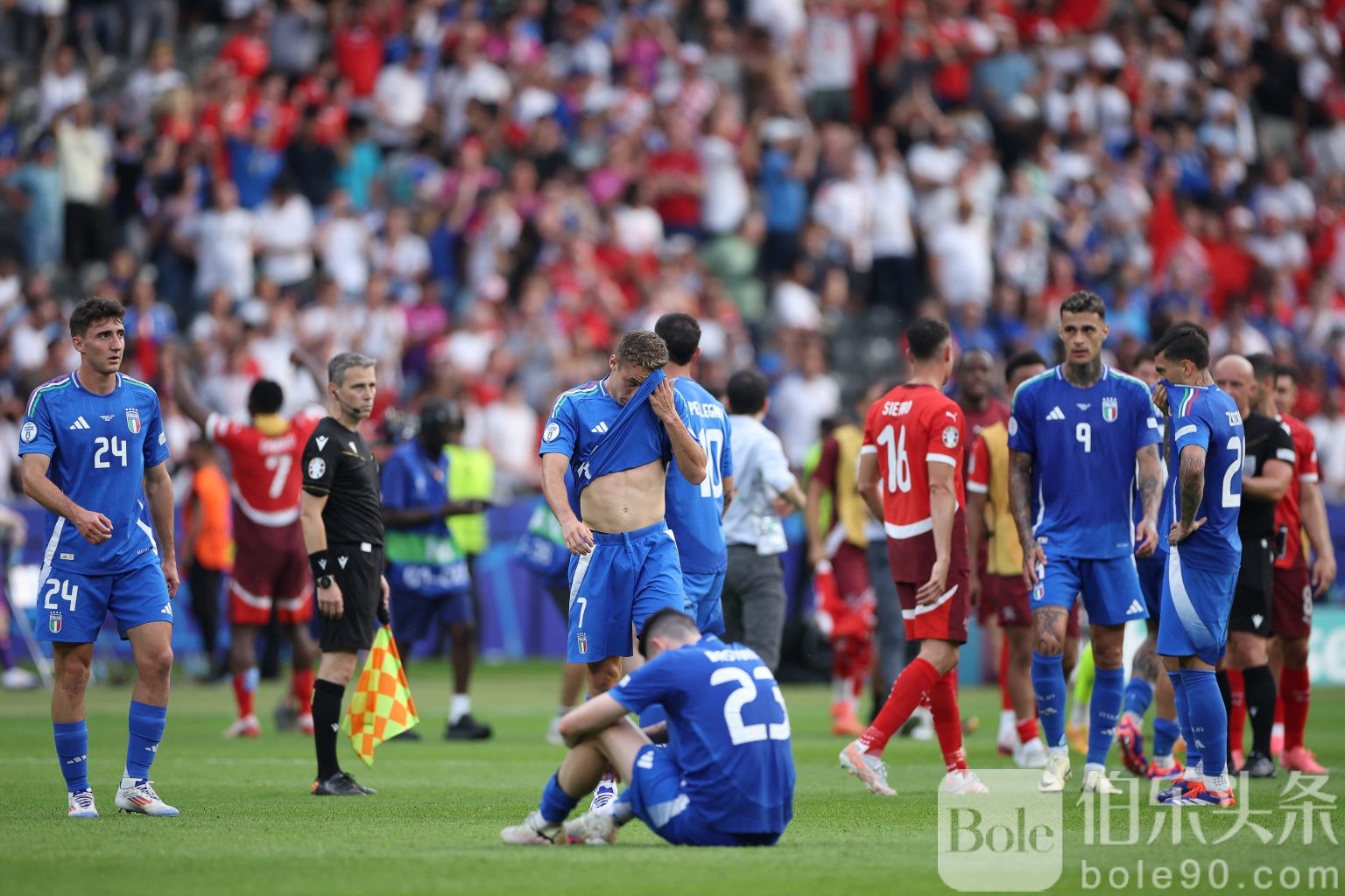 意大利(433):1-多纳鲁马/13-达米安(75'24-坎比亚索)、23-巴斯托尼、17-曼奇尼、2-迪洛伦佐/18-巴雷拉(64'19-雷特吉)、21-法乔利(86'7-弗拉泰西)、16-克里斯坦特(75'10-佩莱格里尼)/22-沙拉维(45'20-扎卡尼)、9-斯卡马卡、14-基耶萨