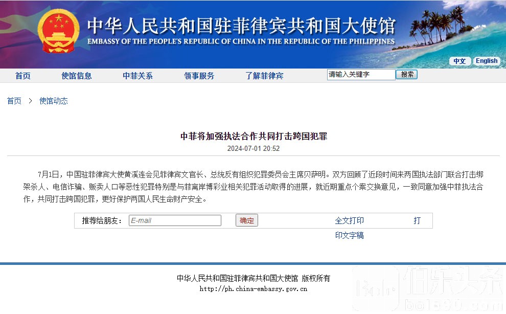 中国大使馆:中菲将加强执法合作共同打击跨国犯罪