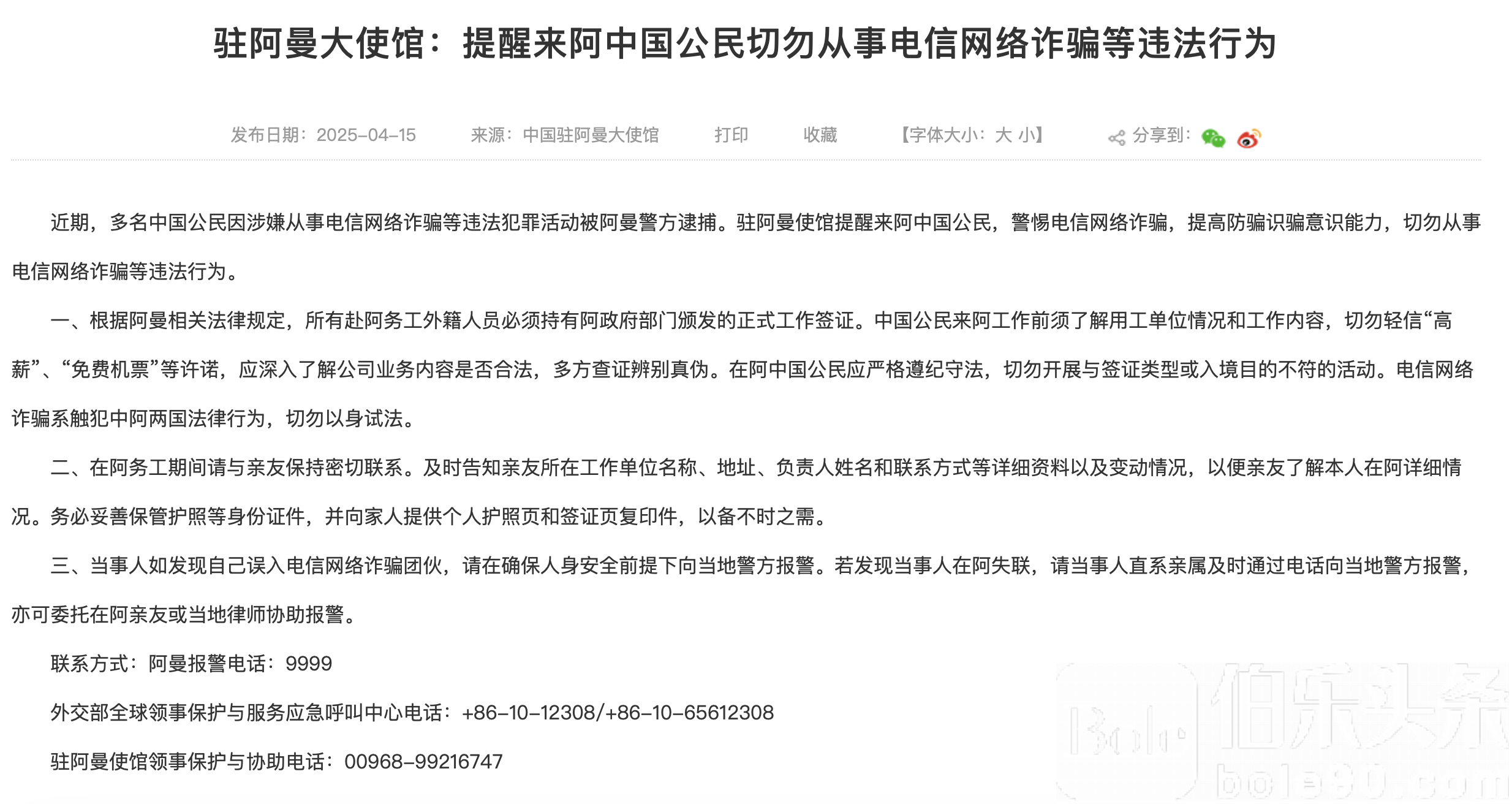 驻阿曼使馆提醒来阿中国公民,警惕电信网络诈骗,提高防骗识骗意识能力,切勿从事电信网络诈骗等违法行为。