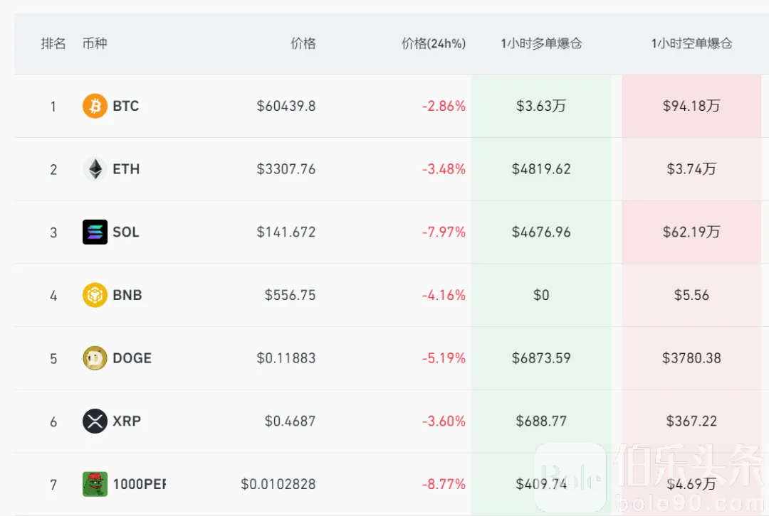 根据CoinGecko的数据,全球加密货币市值目前约为2.35万亿美元,与前一天相比下降了3.5%。据CryptoPotato数据,比特币(BTC)的价格回撤至60000美元大关,而以太坊(ETH)则跌至约3300美元。