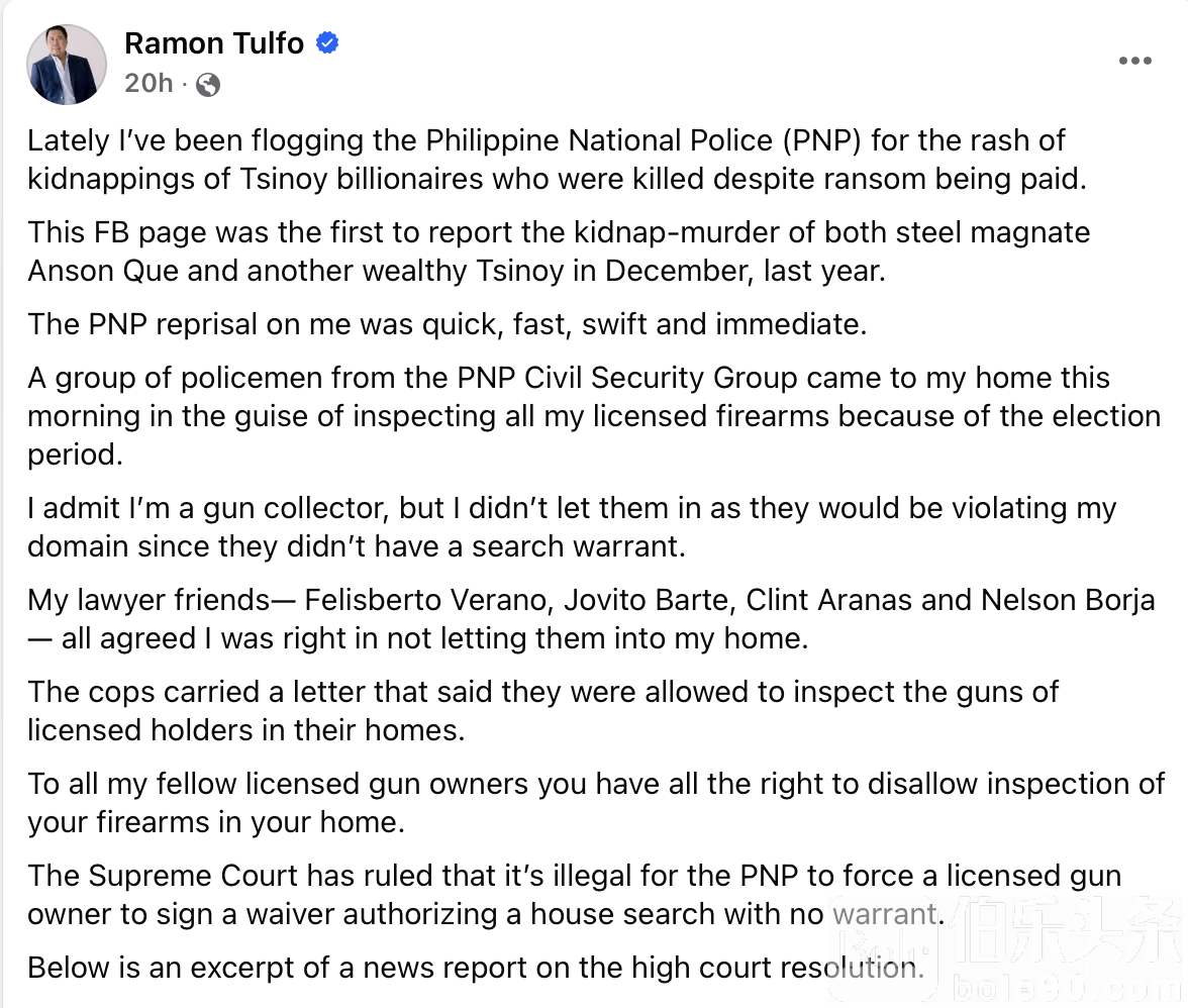 伯乐头条专讯:一名长期批评菲律宾国家警察(PNP)处理绑架华商案件不力的枪支收藏家日前公开表示,自己疑似因言论而遭到警方“秋后算账”。