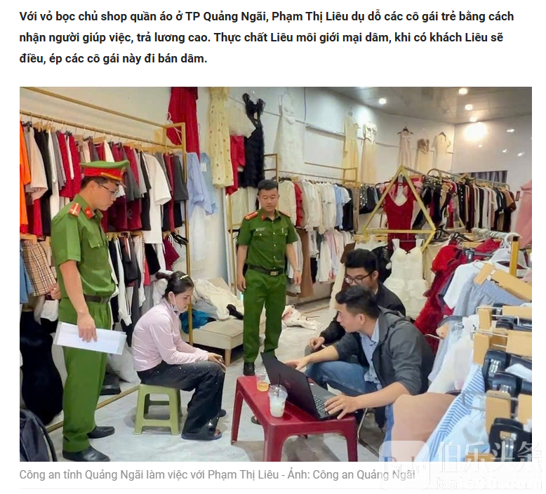伯乐头条专讯:据越南广义省警方4月22日通报,一名涉嫌利用“高薪招聘”伪装实施性交易引诱的女子已被逮捕。26岁的范氏柳(音译,Phạm Thị Liêu)在广义市以经营服装店为掩护,专门诱骗年轻女性参与非法性服务。