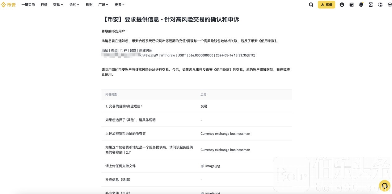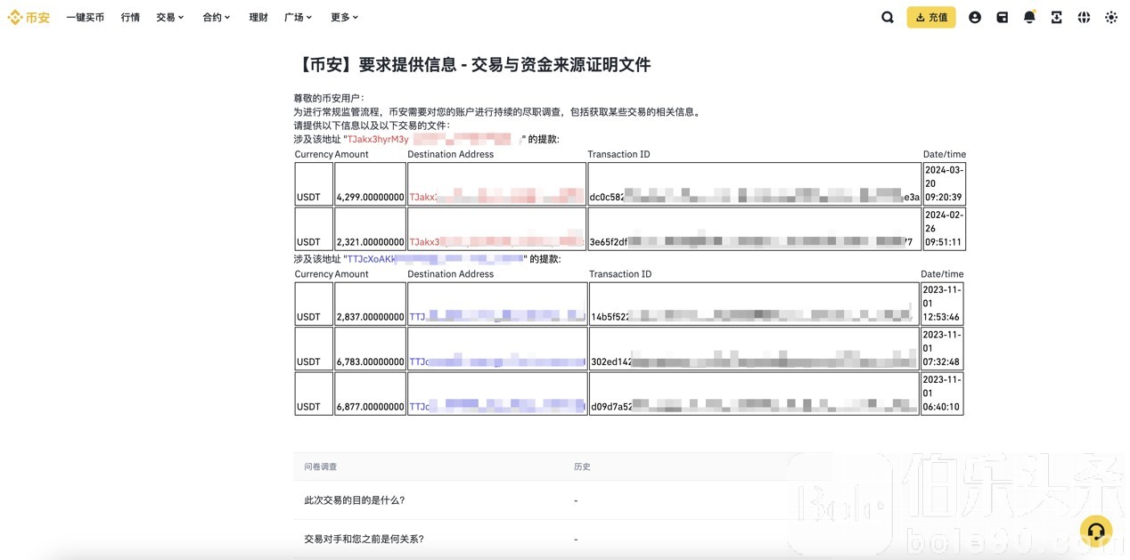 (涉及与被标记地址交易后,被币安官方要求提供资金证明)