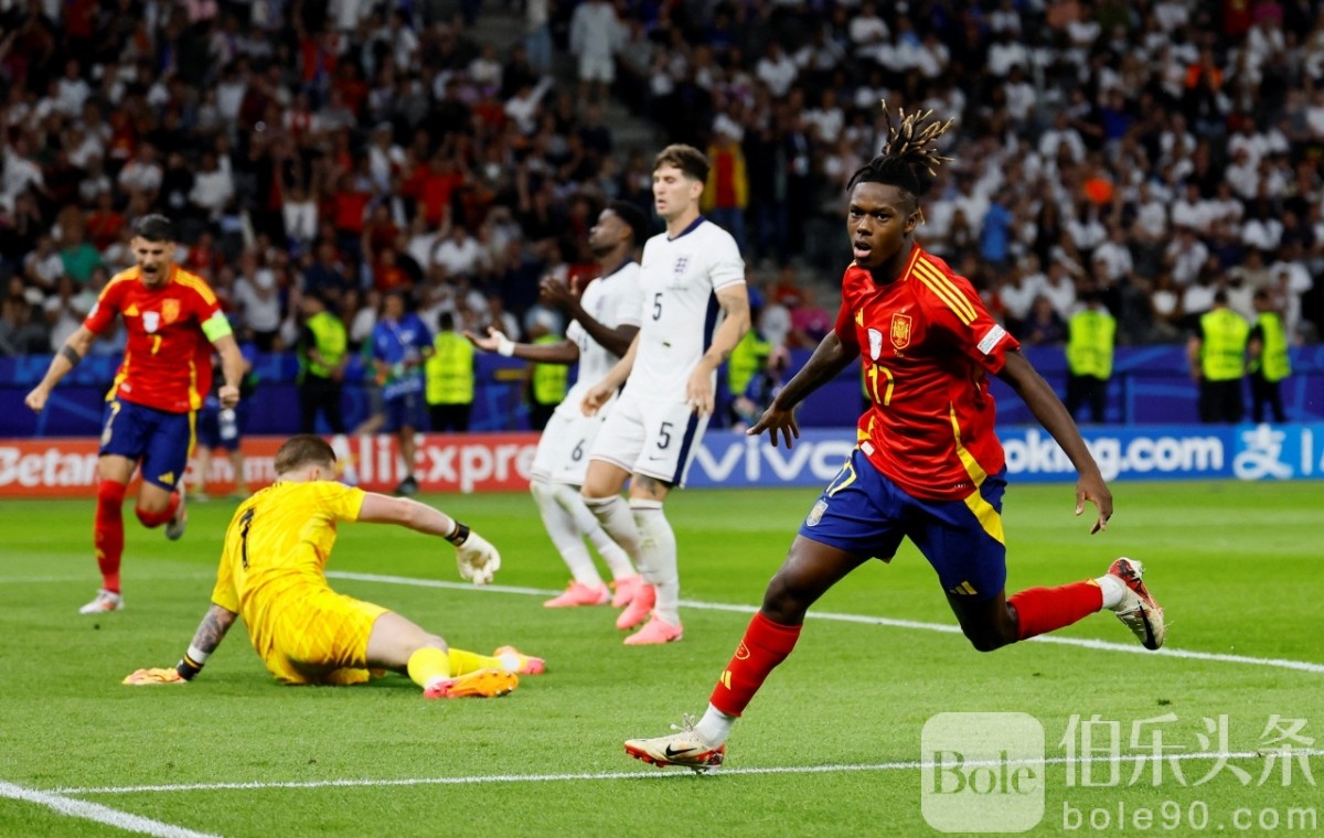 西班牙首开纪录的进球由皇马和巴萨球员联手完成。后卫丹尼·卡瓦哈尔巧妙地将球传给右侧的亚马尔,这位17岁的天才前锋甩开了卢克·肖的防守,将球传到禁区左侧,威廉姆斯俯身左脚斜射,攻破了乔丹·皮克福德的十指关。