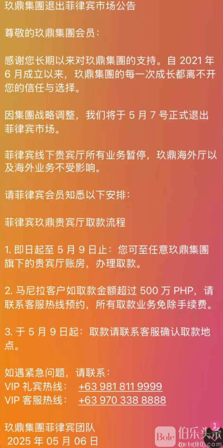 对于马尼拉地区金额较高(超过500万比索)的提款申请,玖鼎特别提示须事先拨打客服热线预约,以确保安全和资金调度。集团声明指出,所有提款将在该期限内免收任何手续费。