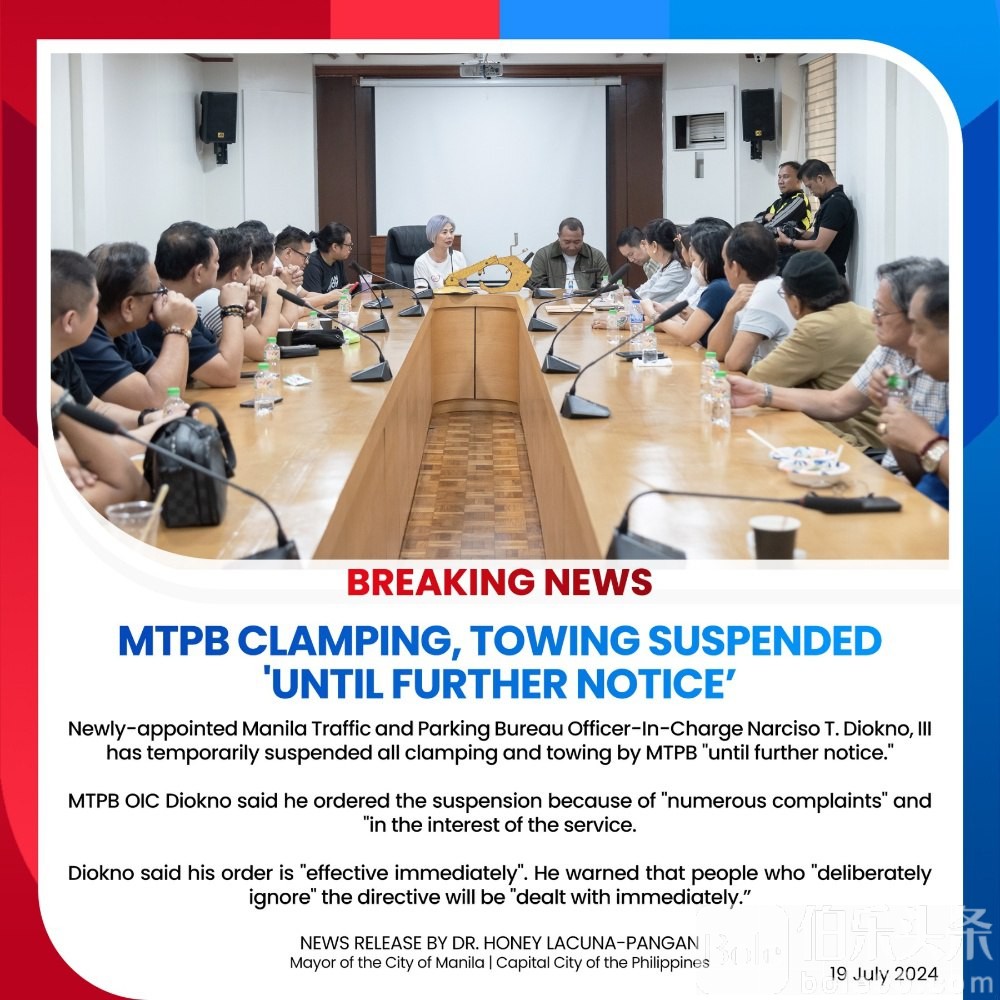 伯乐头条专讯:马尼拉交通和停车局(MTPB)于7月19日星期五宣布,该市所有拖车和锁车业务将暂停,“直至另行通知”。
