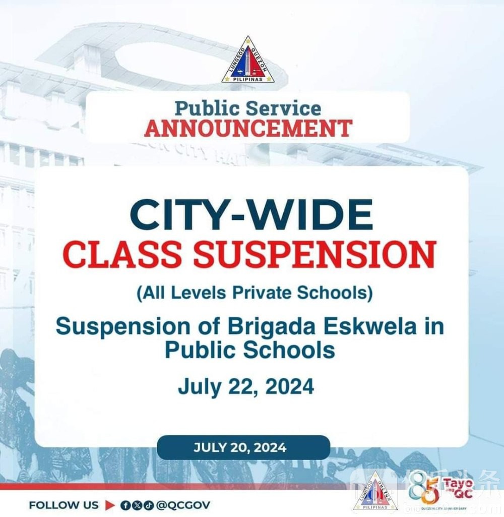 根据公告,奎松市所有公私立学校将暂停课程。这一决定旨在鼓励学生关注总统的国情咨文,并缓解城市交通压力。