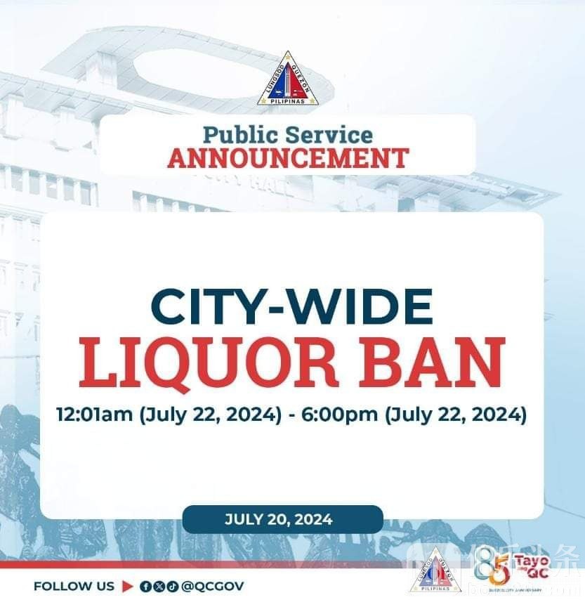 伯乐头条专讯:菲律宾奎松市(Quezon City)地方政府宣布,由于小马科斯总统将在7月22日(星期一)发表国情咨文,该市当天将实施停课和禁酒令。