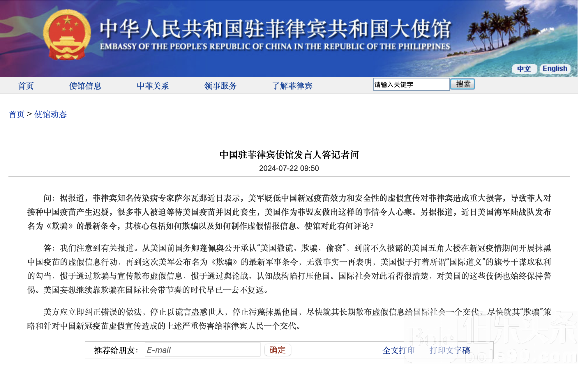 美方应立即纠正错误的做法,停止以谎言蛊惑世人,停止污蔑抹黑他国,尽快就其长期散布虚假信息给国际社会一个交代,尽快就其“欺骗”策略和针对中国新冠疫苗虚假宣传造成的上述严重伤害给菲律宾人民一个交代。
