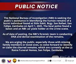 伯乐头条专讯:菲律宾国家调查局(NBI)正寻求公众协助,以确认今年4月1日于三描礼士省圣费利佩镇圣拉斐尔街苏基特社区(Sitio Sukit, San Rafael)发现的一具严重烧焦尸体的身份。