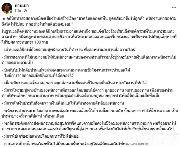 伯乐头条专讯:据泰媒报道,2025年5月11日,Than Pao粉丝专页发布了一个令人震惊的故事,一名前员工投诉清迈市中心一家著名美容诊所,表示这家美容诊所的许多行为被认为是非法的,包括使用假冒产品、从掉在地上的药瓶中吸药并注射给顾客、使用非医生人员进行手术、悬挂医生的名牌欺骗顾客、威胁员工加班、不支付佣金、扣除社保金但不发放、威胁辞职员工的家属。超过100名受害者要求该机构紧急调查。