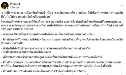 Pao的主页上留言称,“清迈市中心一家美容诊所‘肉毒杆菌破碎瓶子掉在地上,被吸回去注射给顾客,没达标的员工被骂去死,店里所有东西都是假的’。作为美容诊所前员工,我谨就店主的不当行为及可能存在的违法行为提出投诉,以便执法人员协助调查,为100多名受害者讨回公道。”