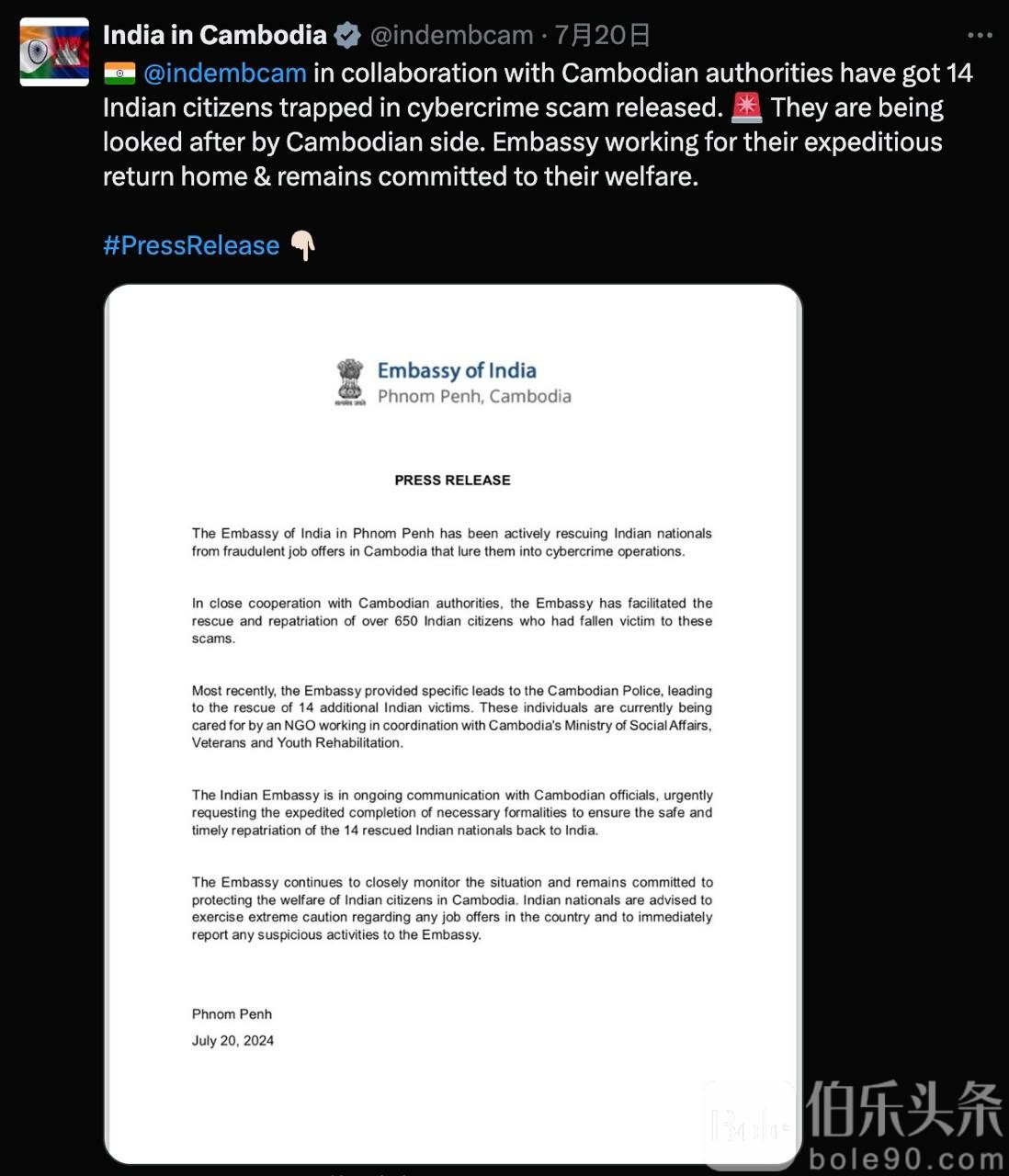 此外,印度大使馆还表示,截至目前,他们已经在柬埔寨成功营救了超过650名被迫从事电诈的印度公民,并帮助他们安全返回家乡