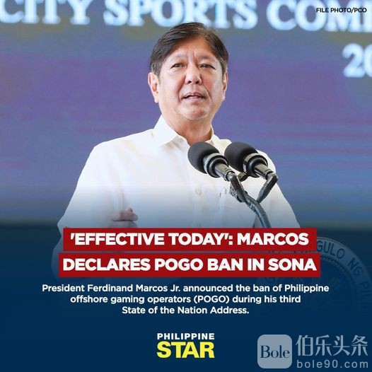 伯乐头条专讯:今天,7月22日,小费迪南德·“邦邦”·马科斯总统在第三次国情咨文上宣布:禁止该国所有菲律宾离岸博彩运营商。