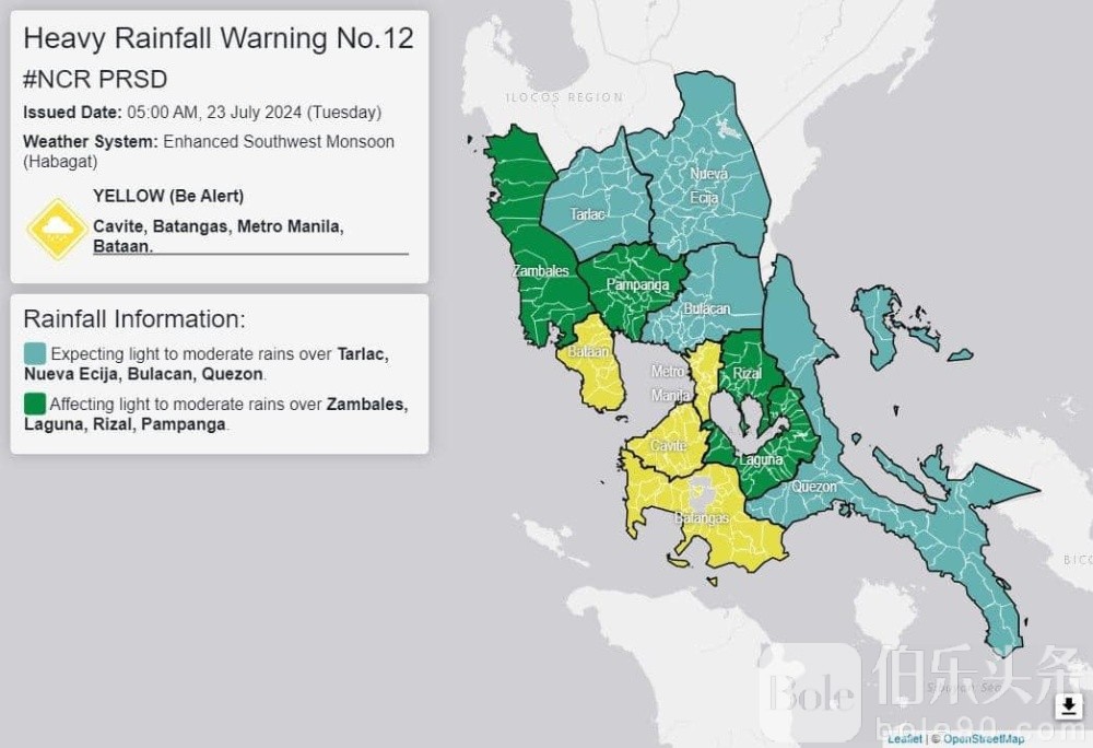 首都区、甲美地省(Cavite)、八打雁省(Batangas)和巴丹省(Bataan)均发布了黄色大雨警报,表明这些区域面临较高的洪水风险,可能会出现淹水或洪水情况。
