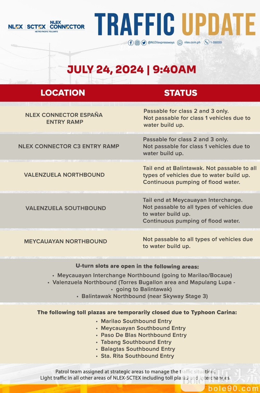 上午10点左右,北吕宋高速公路(NLEX)部分路段和收费站,宣布因积水问题严重而暂时关闭。