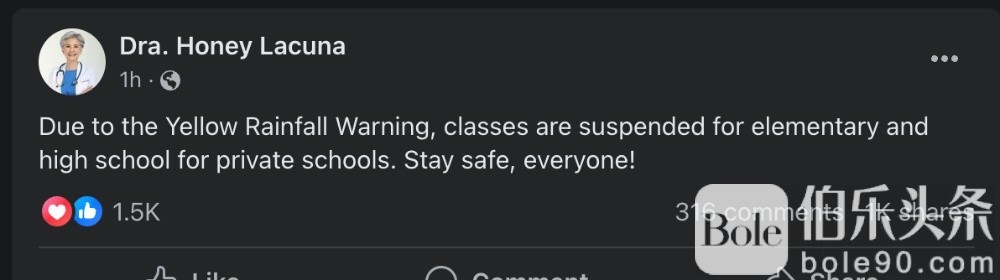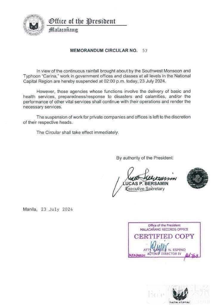 7月23日上午,马尼拉大都会也宣布,从2024年7月23日(周二)下午2点起暂停各级政府工作和学校课程。
