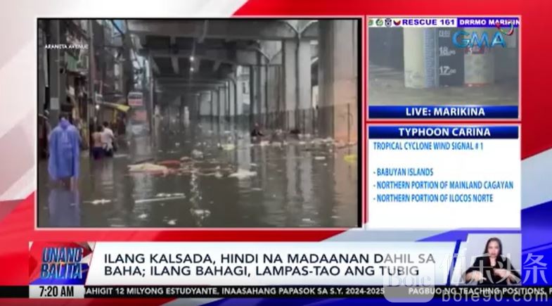 7月23日凌晨5点,菲律宾气象局(PAGASA)发布报告称,热带风暴“卡丽娜”(Carina,国际名“格美”)已增强为台风。此时,甲米地部分地区已经因强降雨引发洪水,多个地区被淹没。