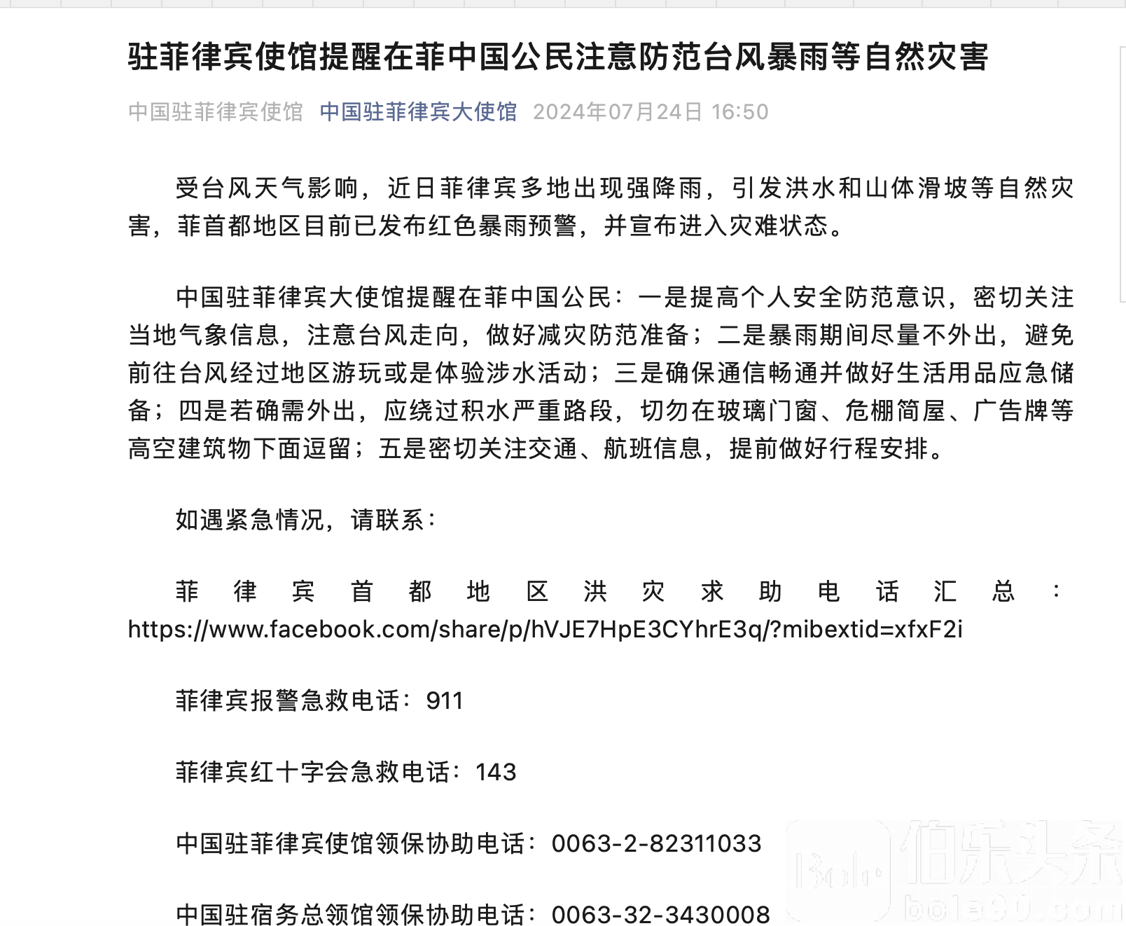 菲律宾首都地区洪灾求助电话汇总:https://www.facebook.com/share/p/hVJE7HpE3CYhrE3q/?mibextid=xfxF2i