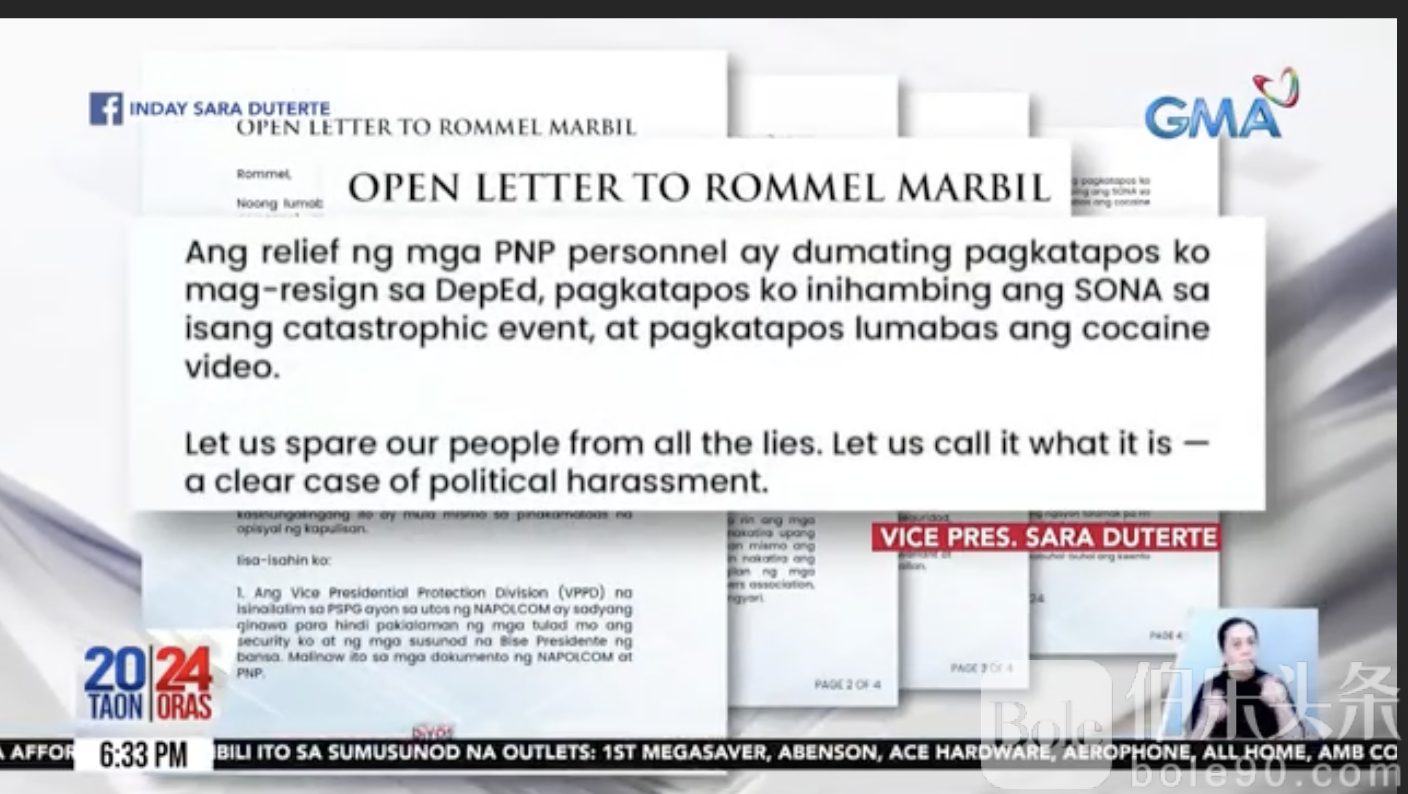 莎拉表示,安保人员是在她辞去教育部长一职,以及网上流传疑似总统小马可斯吸毒的影片后被撤除的。她还对马比尔所说她没有面临威胁的说法提出质疑,称她家人最近在尼诺伊·阿基诺国际机场被偷拍,他们确实面临安全威胁。