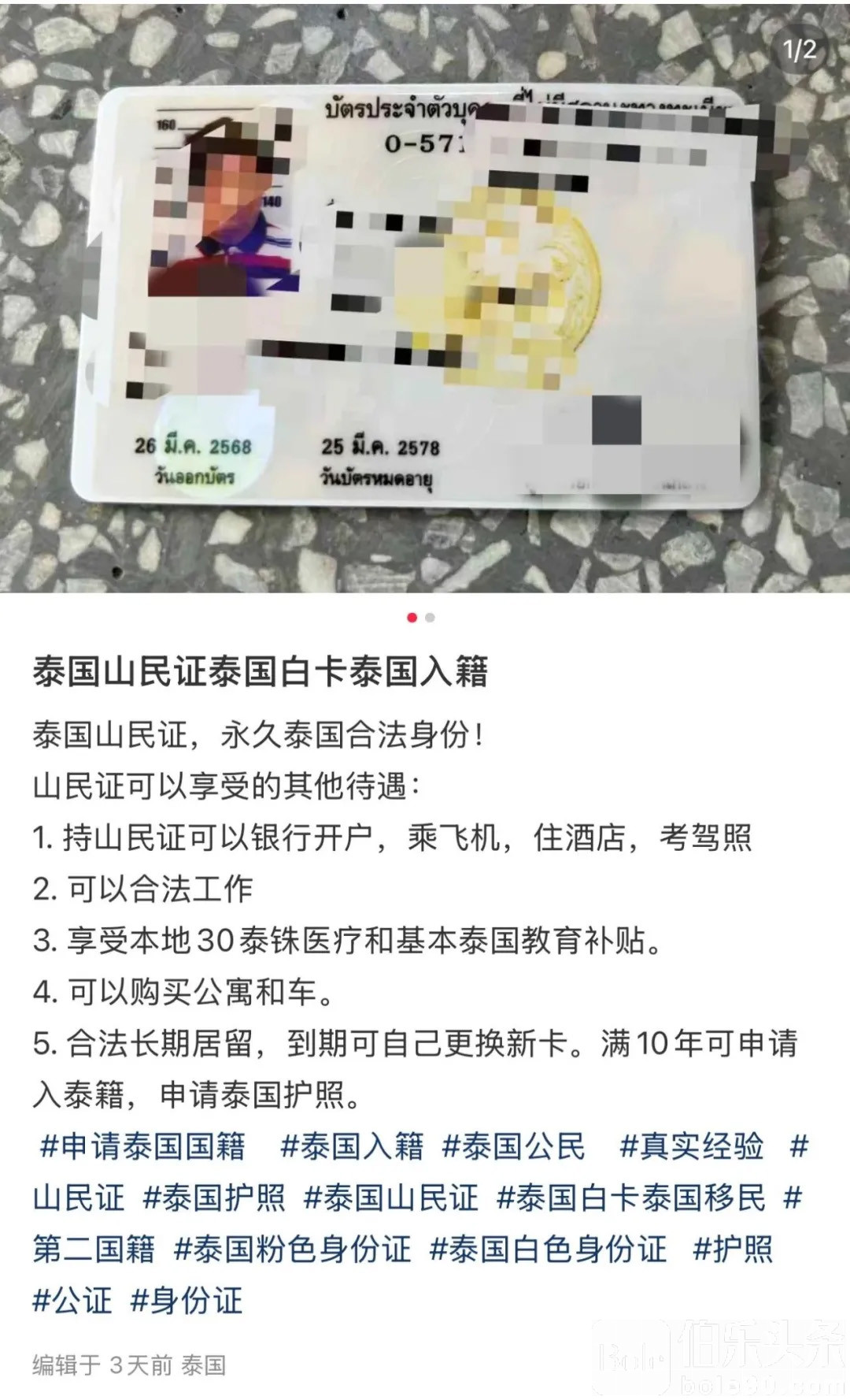 伯乐头条专讯:泰国当局近日就一则在中国社交平台“小红书”流传的贴文做出紧急回应。该贴文声称,只需购买所谓“泰国山民证”(即“白卡”),就能轻松取得泰国国籍,并拥有购房与工作权利,引发泰国国内舆论震动。