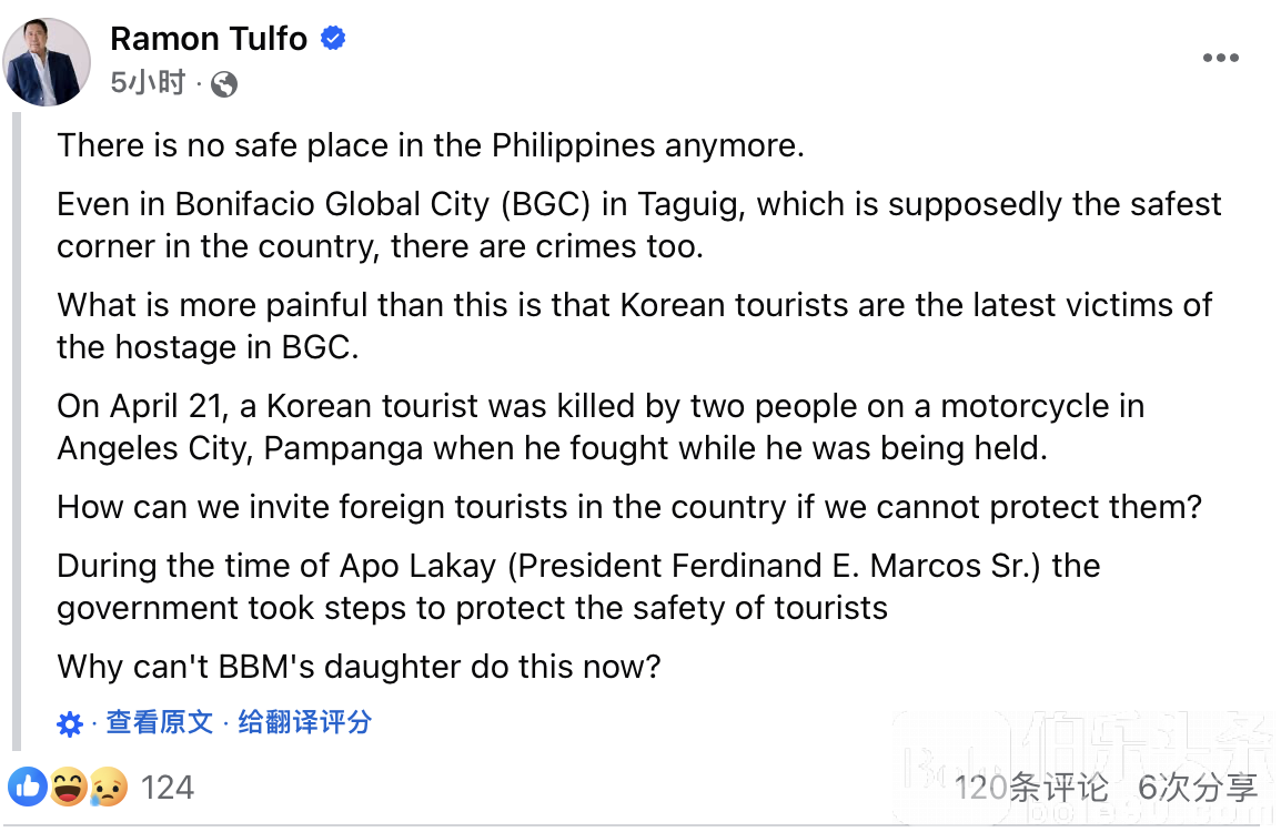 那是4月21日,在邦板牙省安吉利斯市。这位韩国游客在被劫持期间,与两名骑摩托车的人发生冲突,最终不幸身亡。这起悲剧让我感到愤怒和羞愧。我们连来到这里的外国游客都保护不了,还有什么脸去邀请他们来菲律宾观光?