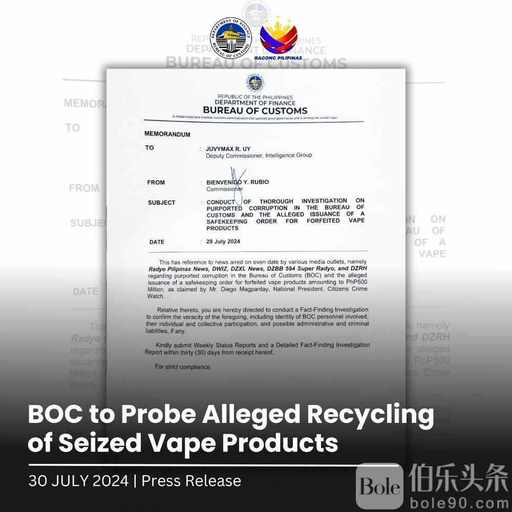 海关局长卢比奥(Bienvenido Rubio)已指派情报组副局长Juvymax R. Uy负责此次调查,以验证指控的真实性并确定任何涉事人员及其责任。调查结果将用于评估可能的行政和刑事责任。