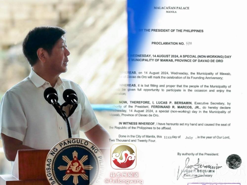马科斯总统表示,考虑到Mawab镇的建镇周年庆祝活动,让当地人民有充分的机会参与和享受庆祝活动是合适和恰当的。