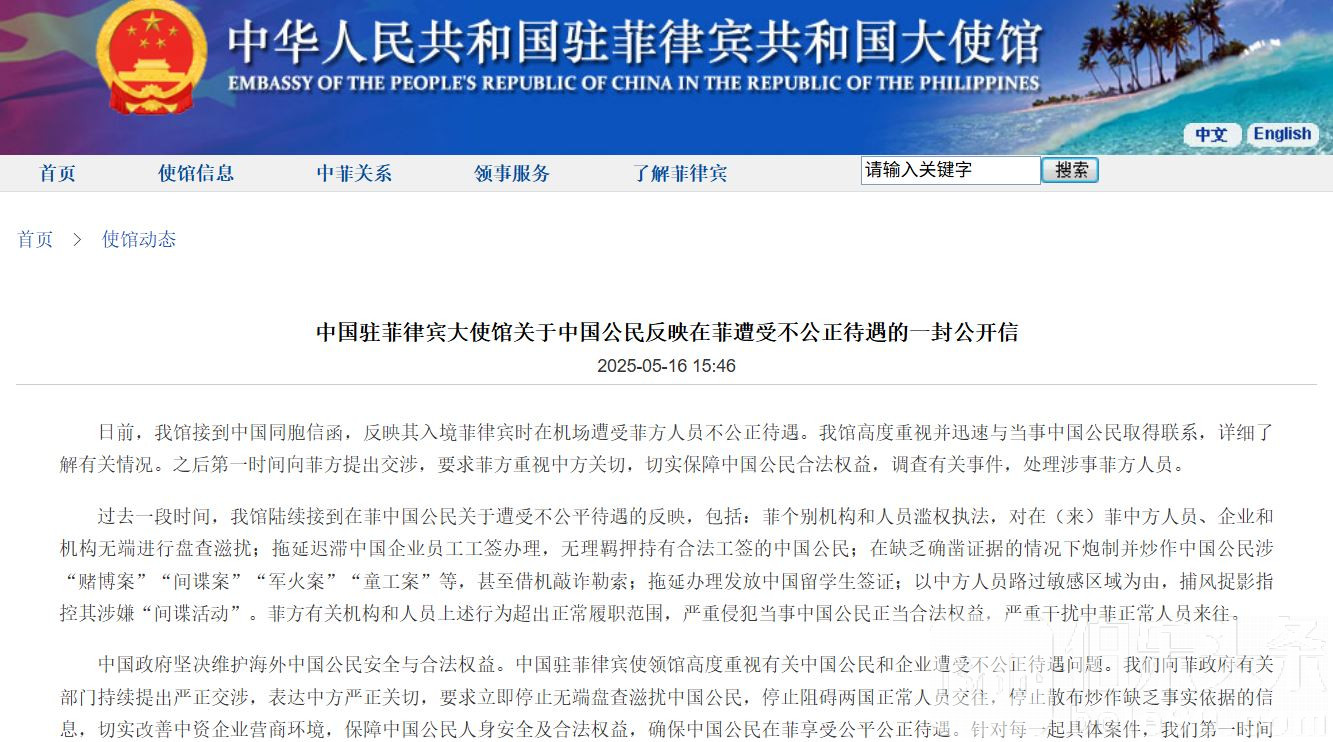 大使馆也收到了不少反馈,公开信中写得很清楚:过去一段时间,很多在菲中国公民都反映自己受到了“不公平对待”。被无理羁押、签证迟迟不办、莫须有被栽赃搞“赌博案”“间谍案”,甚至还被某些执法人员趁机敲诈。