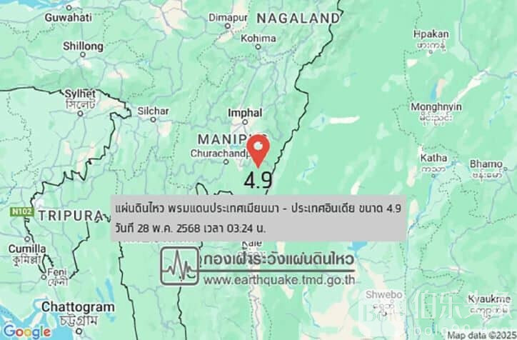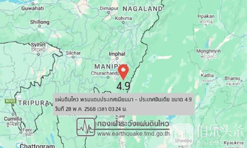 据泰国地震观测部门通报,当天凌晨3点24分,缅甸与印度边境地区发生本轮地震中震级最强的一次,达4.9级,震源深度10公里。此次地震虽未造成重大损失,但包括清迈府、夜丰颂府在内的多个泰国北部地区均有震感。